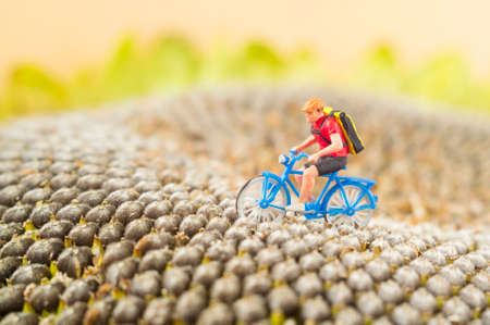 A toy cyclist is taking a ride on the middle of a sunflower. Ecotourism concept.