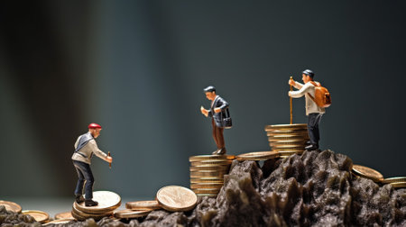 Miniature people. Climbers are climbing coins. Success business concept. business concept. Generative AI