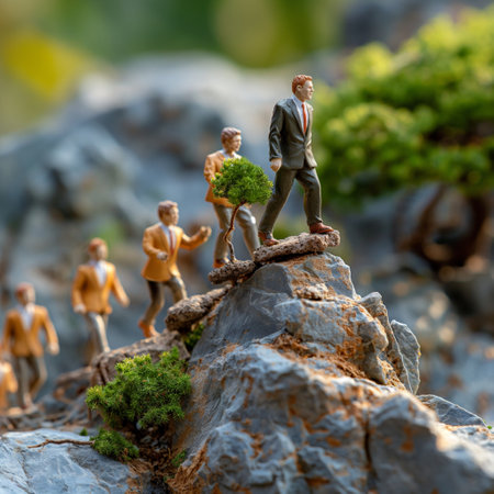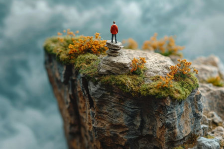 Fun concept of miniature hiker figure adventure in the rocks, outdoor, daytime