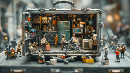 Miniature people of worker loading thing to submarine on wood table with nature background. Selective focus