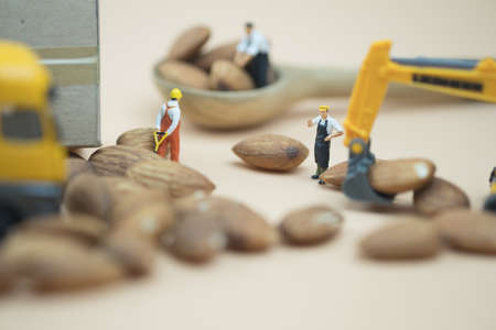 Miniature people worker move and select almonds for import and export. Agriculture concept