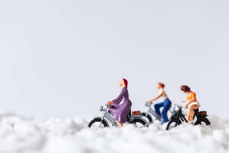 Miniature people : walking on the snow in winter season. Image use for Christmas and new year concept.