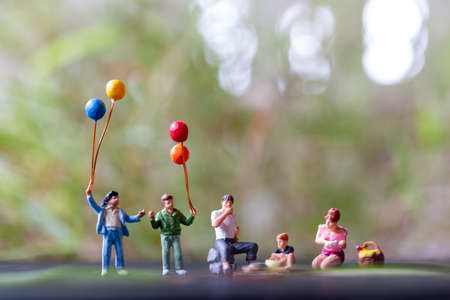 Miniature people : Happy family sitting on the mat during a picnic in a park