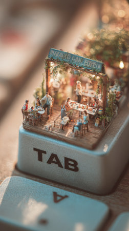 A macro photograph captures a detailed miniature diorama on a computer keyboard key. The tiny scene depicts a restaurant interior with figures gathered around tables. The composition uses warm lighting, creating a cozy atmosphere. Potential applications include illustrations for lifestyle concepts and editorial projects.