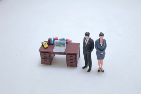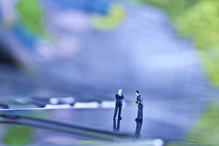 three miniature people placed or paired. Abstraction of a meeting, discussion, conversation. People discuss news and rumors. businessman holding.