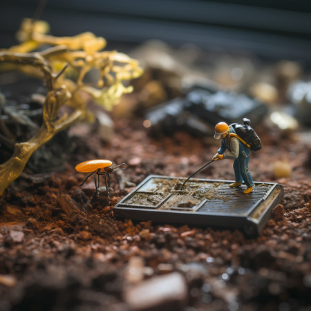 A close-up image showcases miniature figures of a father and child walking through a lush green forest. The scene is filled with vibrant green foliage, small trees, and yellow moss, creating a miniature world. The figures are small in scale, adding a sense of wonder and perspective to the scene.