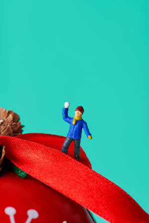 closeup of a miniature kid about to throw a snowball, on a red christmas ornament, on a blue background with some blank space on top