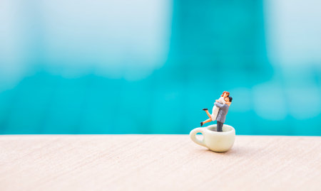 Miniature couple in coffee cup with space on blue water background, outdoor day light, valentine card background idea