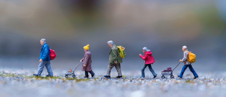 The concept of an aging society is illustrated by a miniature group of old people walking along the graph.