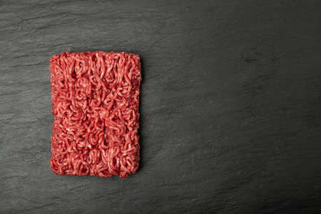Minced beef meat on black background. Ground fresh buffalo meat fillet, uncooked red mincemeat, raw veal forcemeat, farce minced meat portion top view with copy space