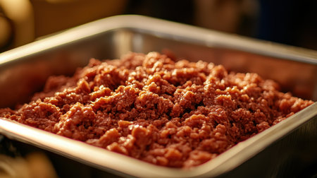 A close-up view of freshly ground meat displayed in a metal tray, highlighting the rich texture and color, perfect for meal preparation in a commercial kitchen setting.