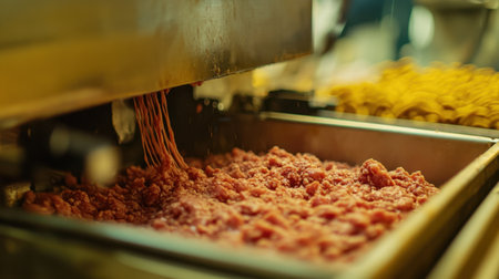 Close-up view of ground meat being processed in a commercial kitchen, showcasing the raw ingredients used in meal preparation and culinary excellence.