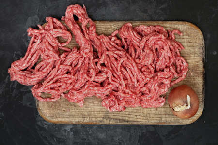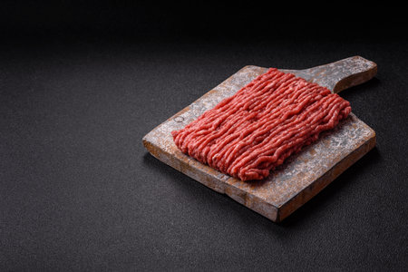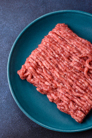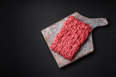Fresh raw beef mince on a dark background. Preparation for cooking of cutlets