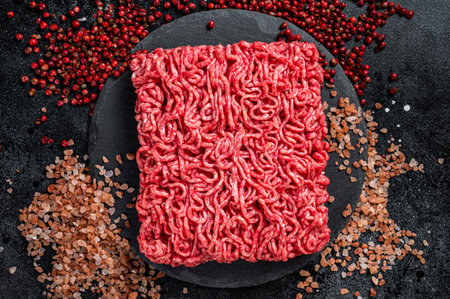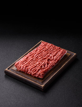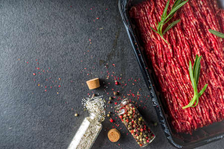 Raw minced beef meat with herbs and spices for cooking, black concrete or stone table