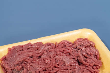 ground red meat in yellow foam board in blue background