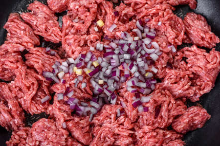 Raw pork and beef ground meat and vegetables