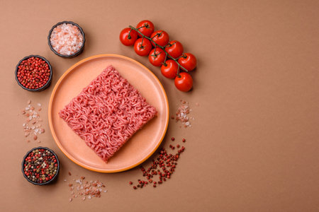 Raw ground beef or pork for burgers or meatballs with salt and spices. Raw ground beef as a food background for your design