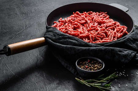 Raw minced pork in a frying pan. Black background. Top view. Space for text.