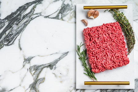 Uncooked Mince from marbled beef Meat, raw ground meat. Marble background. top view. Space for text.