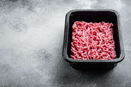 Ground beef meat in plastic tray set, on gray stone background, with copy space for text