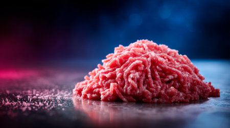 A pile of fresh ground beef sits on a reflective surface, illuminated by colorful lights, emphasizing its textures and colors, perfect for food-related projects.