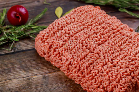 Close up of ground beef with spices and rosemary on wooden background.