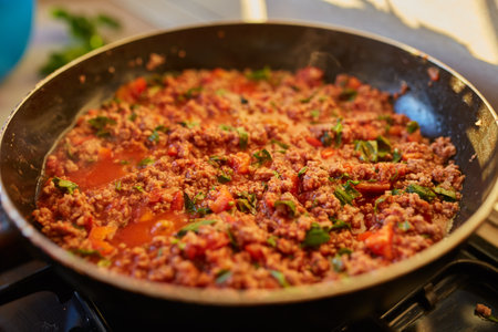 Spaghetti bolognese sauce with fresh basil being fried on a pan