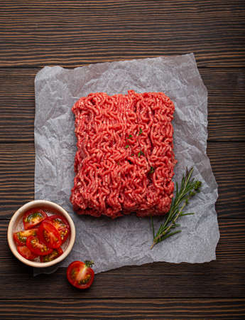 Raw forcemeat beef, ground meat on butcher paper. Dark wooden background. Top view.