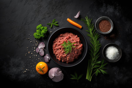 Ingredients and a bowl of raw ground meat on a dark background. Image of cooked ground meat with seasonings and a blank black background for your text. Top down or flat lay perspective. Generative AI