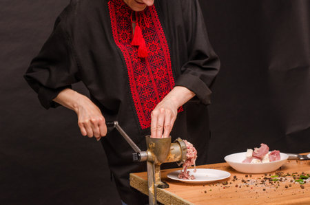 The cook makes minced meat in a meat grinder on a dark background