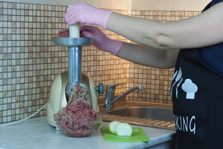 Mincer makes minced beef, pork and onions. Cooking homemade meat food.