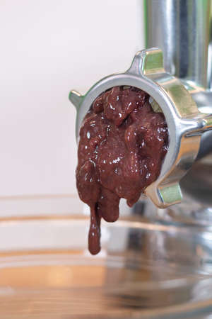 Minced meat coming out from modern electric grinder. Healthy fresh homemade minced meat. Selective focus
