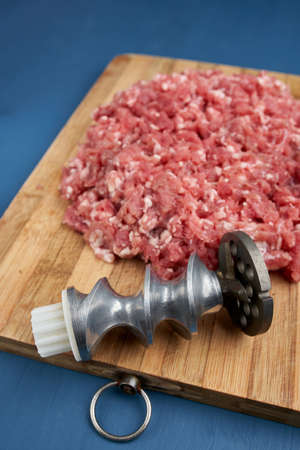 Meat grinder parts and minced meat on a wooden board