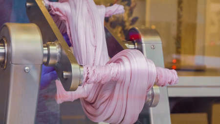 Making purple salt water taffy in small candy shop.