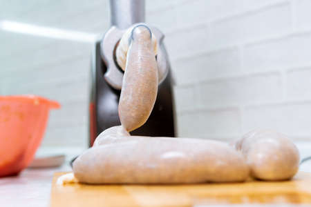 cooking homemade sausages electric meat grinder. home-made food, selective focus