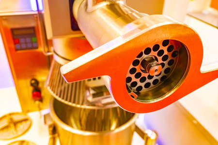 Professional meat grinder close-up. Fragment of a meat grinder on a light background. Concept - equipment for food production. Using a professional meat grinder. Professional kitchen equipment