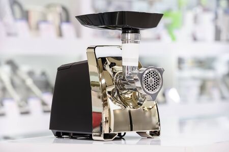 Electric mincer or grinder at retail store shelf, defocused background