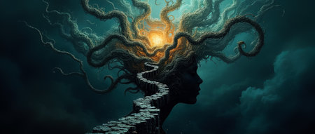 Stone path emerging from woman's head with glowing light amidst intricate branches, symbolizing journey of self discovery and inner peace