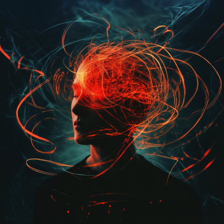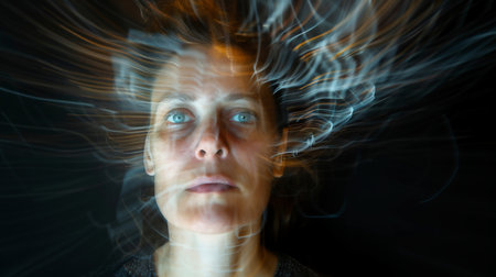A woman stands still, her expression serene, as vibrant, swirling lights dance around her head, creating an ethereal atmosphere. The colors blend seamlessly, forming captivating patterns that evoke a sense of movement and creativity. The background is softly blurred, emphasizing the striking contrast with the lively illumination, suggesting an exploration of inner thoughts and emotions.