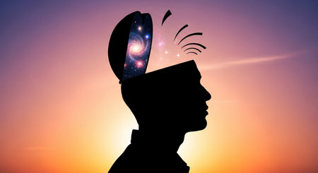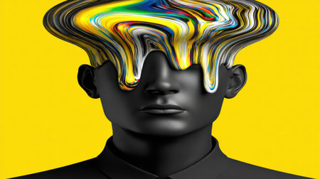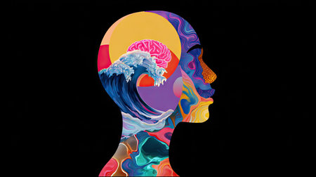 An artistic representation of a human profile featuring vibrant colors and symbolic elements. Inside the head, a wave, sun, and a representation of a brain are visible. The composition uses bright colors and textures against a dark background, suggesting a concept relating to thought, creativity, and the mind. It is suitable for various commercial uses.