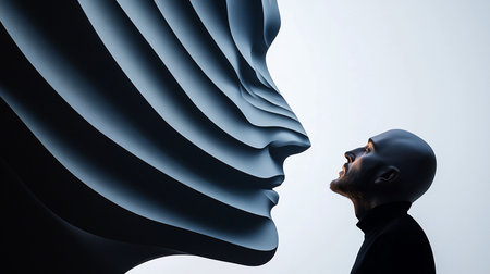 A bald man in black turtleneck looks up at a large, abstract face sculpture composed of horizontal stripes. Dramatic lighting highlights the man's profile and the sculpture's form.