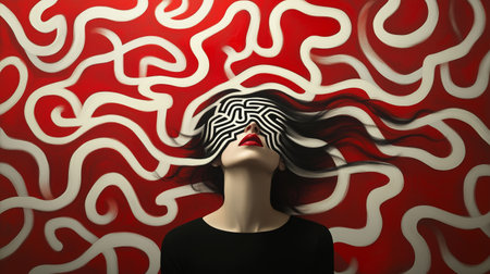 conceptual surreal portrait of a woman with her face obscured by abstract blurred lines. the image symbolizes inner turmoil, anxiety, and identity crisis. minimal and emotional artwork.