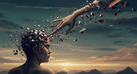 Shattered Mind Reaching for Healing Amidst a Surreal Sunset