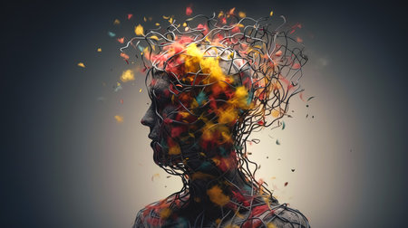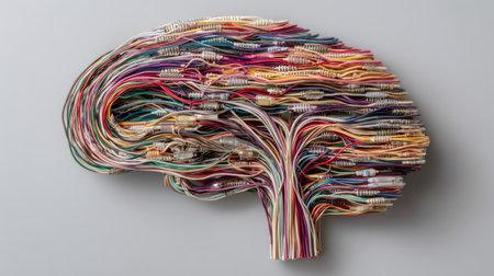 A vibrant representation of the human mind, where a complex network of colorful wires forms the shape of a brain.