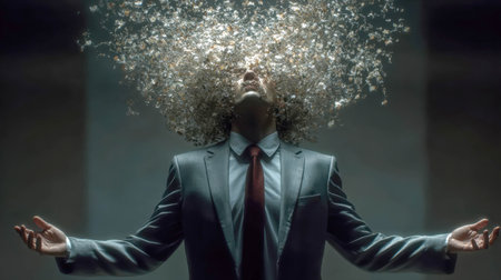 Surreal scene of a businessman in a suit with his head exploding into particles, symbolizing a mind-blown moment.