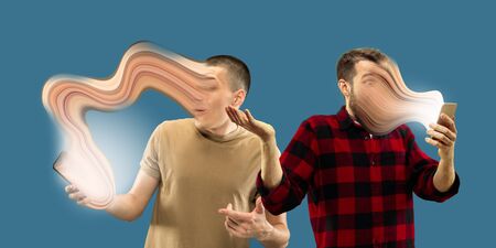 Young men using smartphone isolated on blue studio background. Concept of human emotions, facial expression, sales, ad, engagement by gadget, social media, immersion in vlogging, blogging. Copyspace.