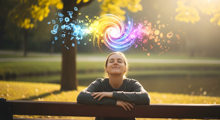 A peaceful woman meditates with her eyes closed on a park bench, while a vibrant, swirling spiral of colorful energy and light emanates from her mind. This conceptual image represents creativity, mindfulness, imagination, mental well-being, and brainstorming.