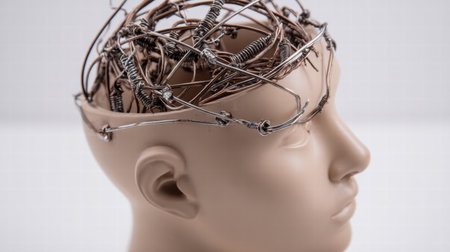 Brain made of colorful wires representing complex thoughts and connections in a creative art piece