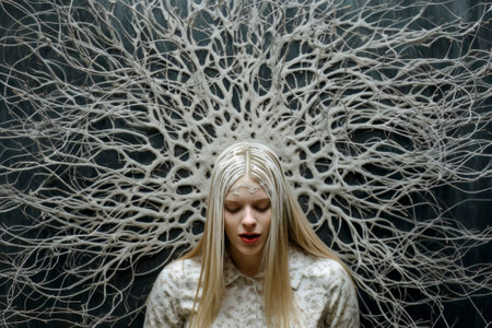 abstract emotional image of a female figure with obscured facial features, wrapped in flowing white strands. metaphor for confusion, fragility, and psychological pressure.