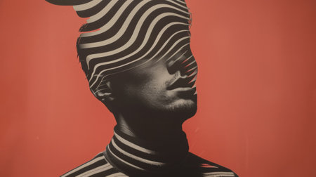 Model with striped mask poses against abstract red and white background in artistic photoshoot